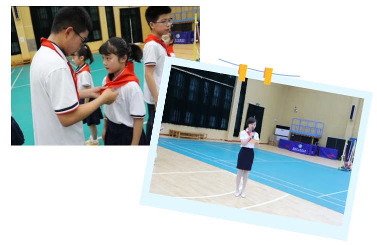 六年級(jí)的老隊(duì)員向新隊(duì)員授紅領(lǐng)巾