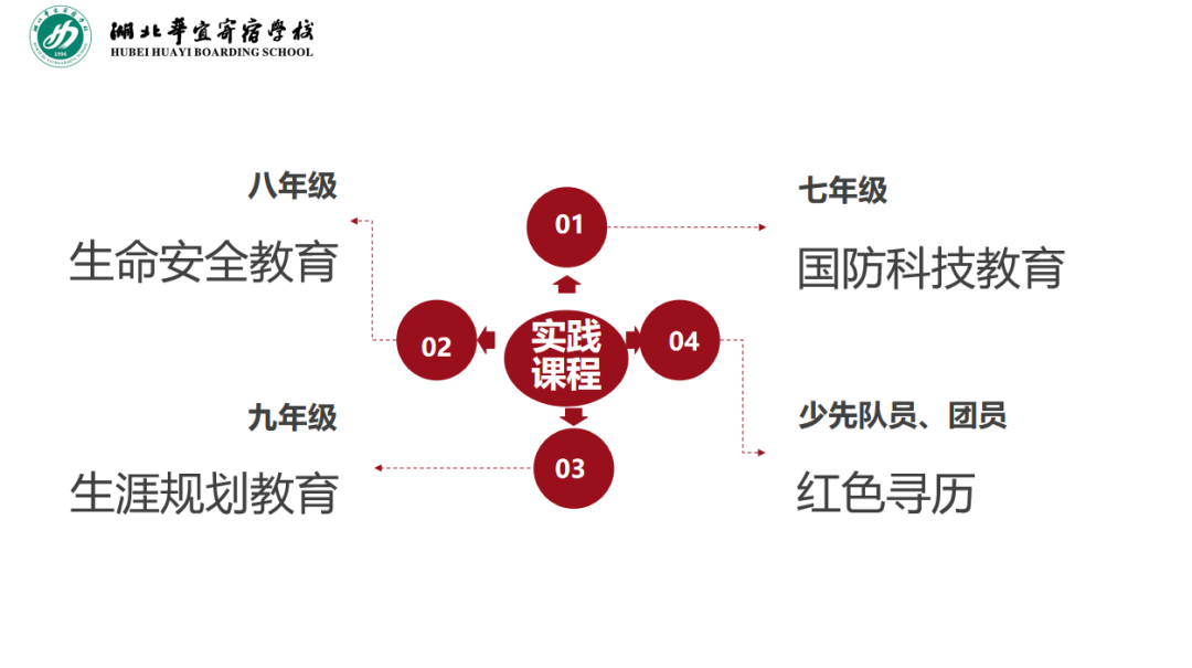 目前的實(shí)踐課程主要有:七年級(jí)國防科技教育、八年級(jí)生命安全教育、九年級(jí)生涯規(guī)劃教育和紅色足跡尋訪活動(dòng)。